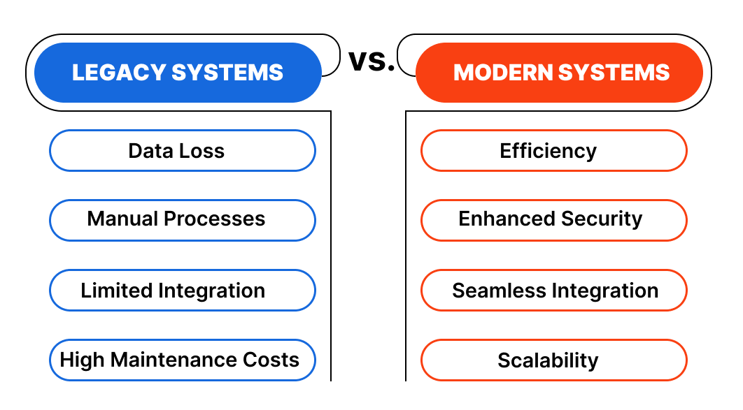 Slow Decision-Making: Legacy systems often store data in separate, outdated platforms that don’t talk to each other. This creates delays in accessing critical information, slowing down your ability to make decisions in real time.
